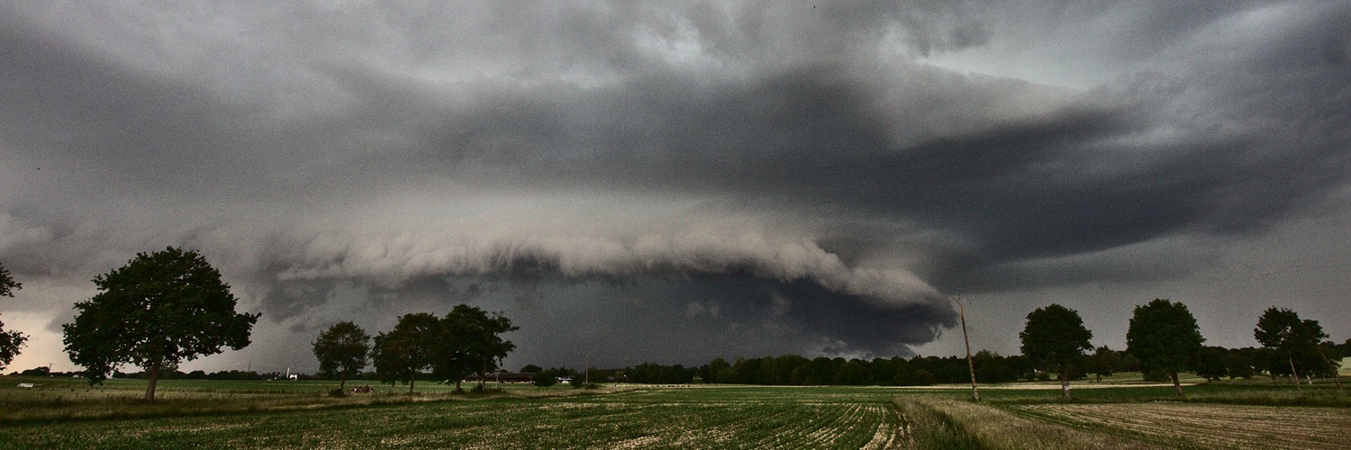 Photo d'une supercellule orageuse au-dessus d'un champ parsemé d'arbres.
